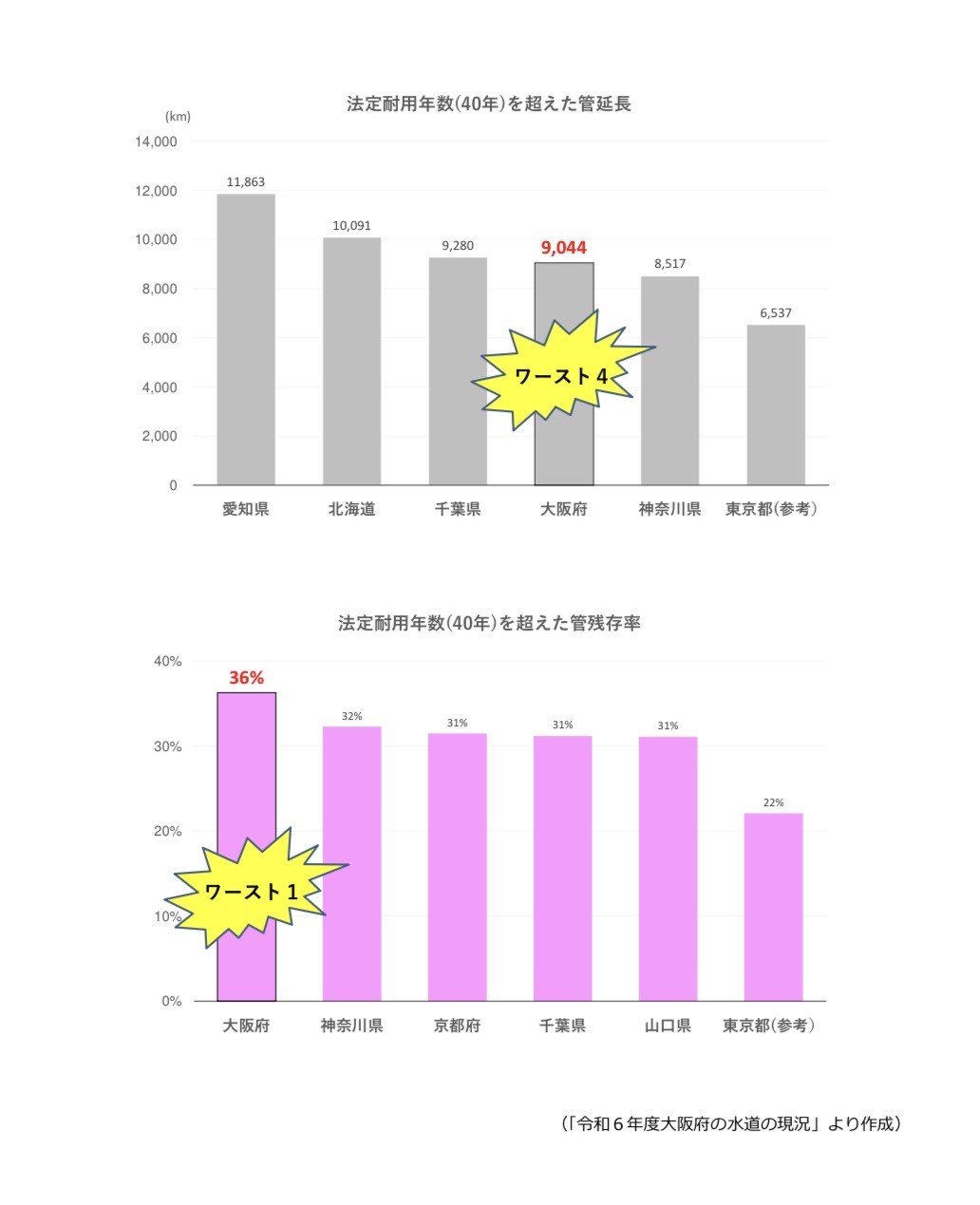 法定耐用年数を超えた管延長が約9,000km 管残存率は約36%で更新需要が増大