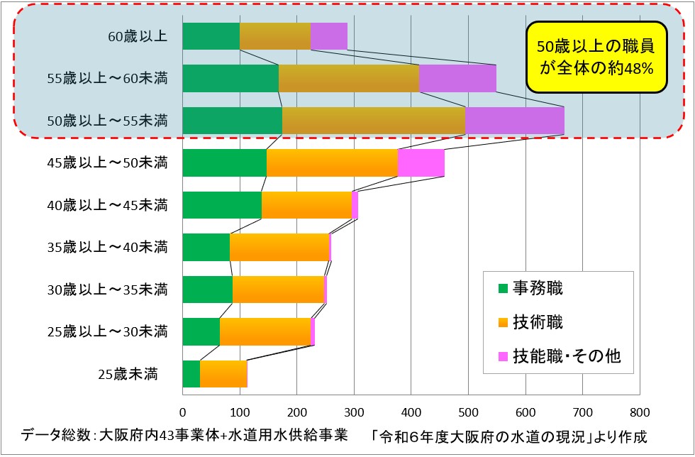 府域の水道事業は、水需要の減少に伴う料金収入の減少をはじめ、老朽化した水道施設の更新や耐震化等に伴う支出の増加、ベテラン職員の退職による技術継承問題など、厳しい経営環境にあります。