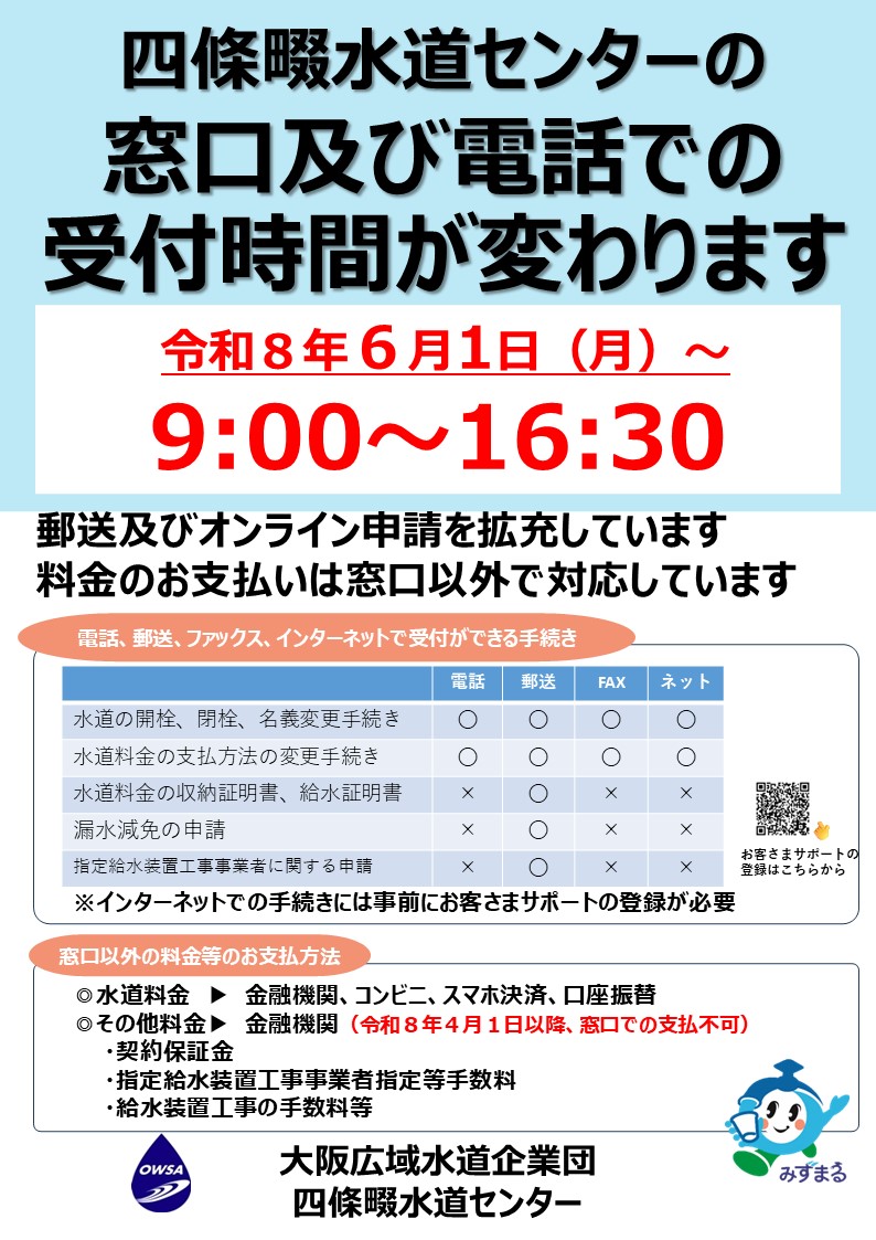 令和8年6月1日(月曜日)から四條畷水道センターでの窓口・電話での受付時間を変更します。