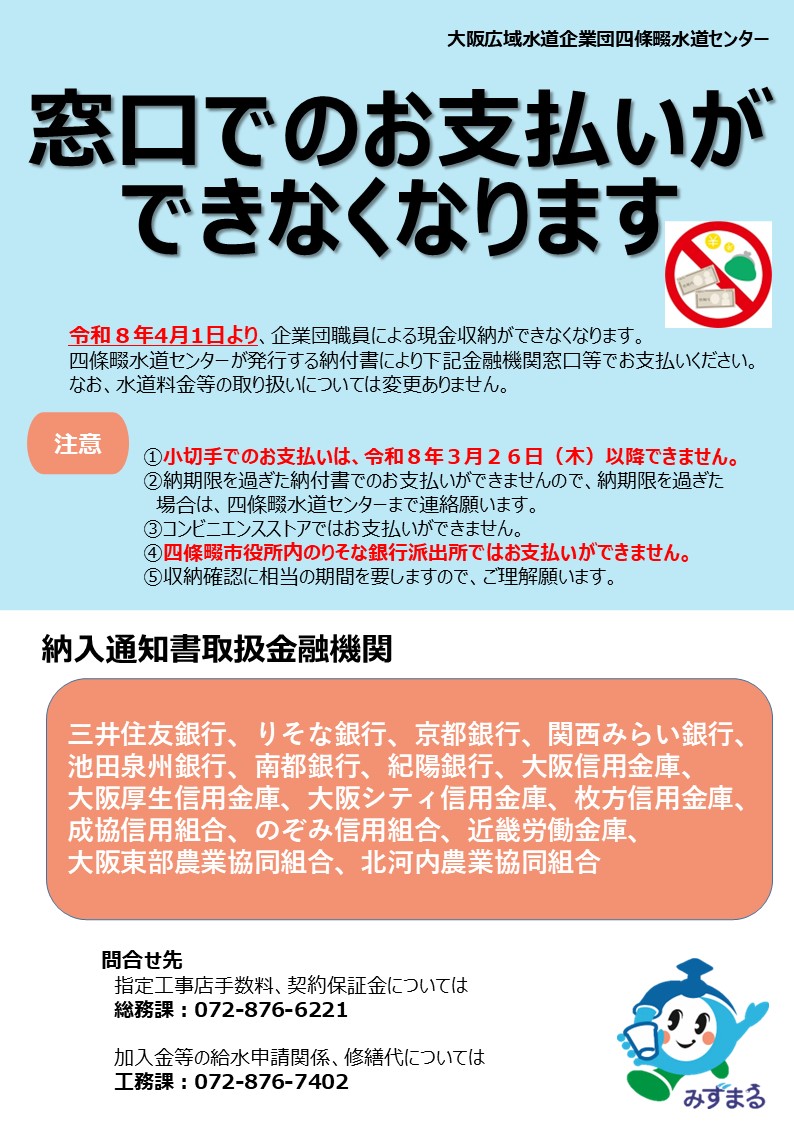 四條畷水道センター窓口での水道料金以外の現金収納の廃止について